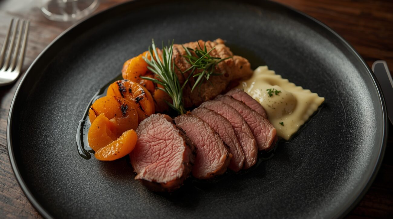 Wildschwein-Rückenfilet mit gegrillten Aprikosen und Kräuter-Ravioli