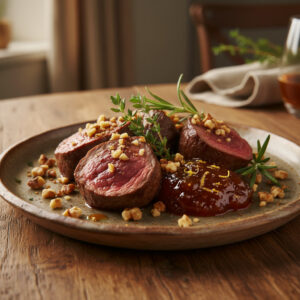 Reh-Medaillons mit Hagebutten-Sauce & Walnüssen