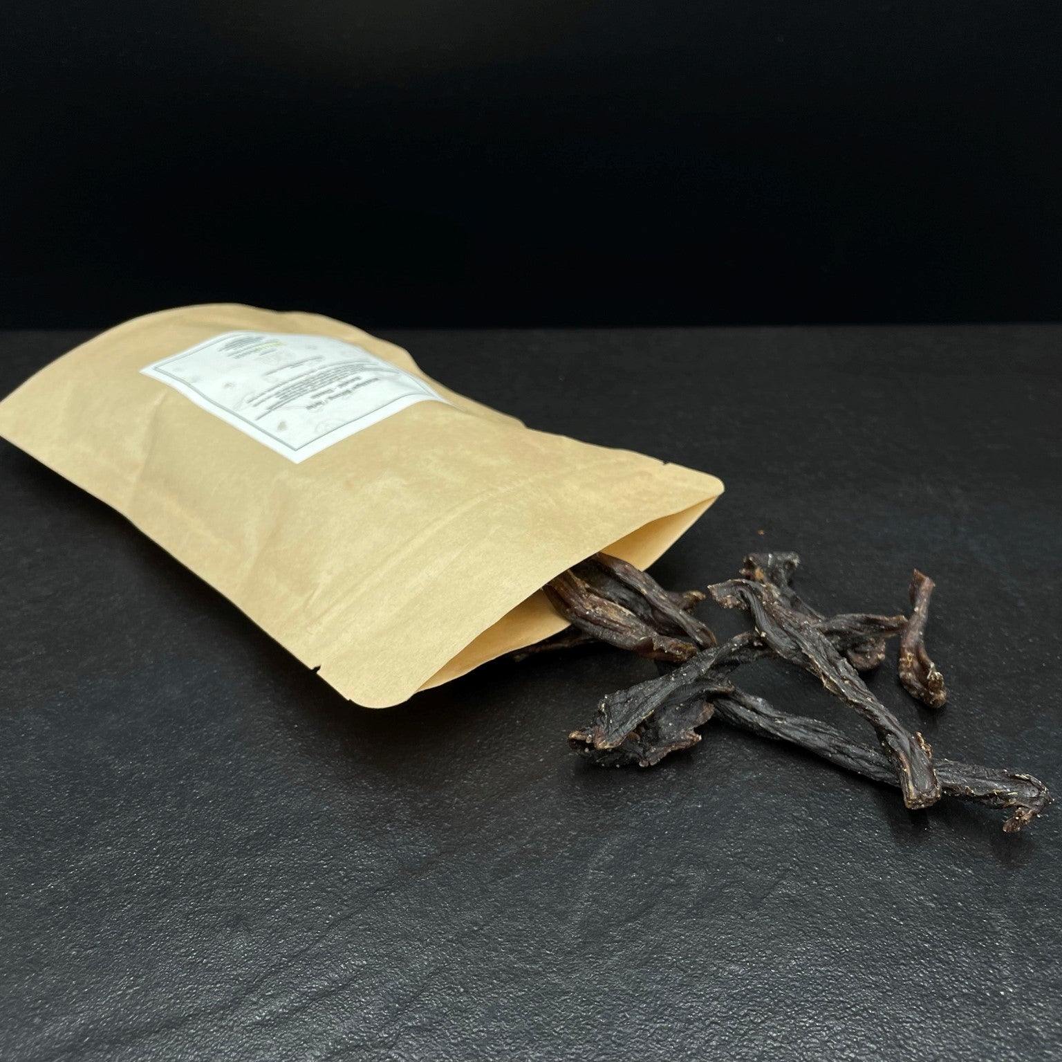 Biltong ist mehr als nur getrocknetes Fleisch: Es ist ein traditioneller Snack mit Ursprung in Südafrika und Namibia, der durch seine besondere Würzung und Herstellung besticht. Unser Biltong aus Schwarzwild bzw. auch Wildschwein wird schonend luftgetrocknet, mit ausgewählten Gewürzen verfeinert und in praktische Streifen geschnitten – perfekt zum Snacken oder als proteinreicher Begleiter für unterwegs.