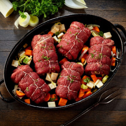 Angus Rouladen Angus-Rouladen für die Zubereitung von feinen Rindsrouladen. Aus Weidehaltung von einem Bio-Betrieb in Sachsen-Anhalt, nahe der Landesgrenze zu Brandenburg. Zutaten