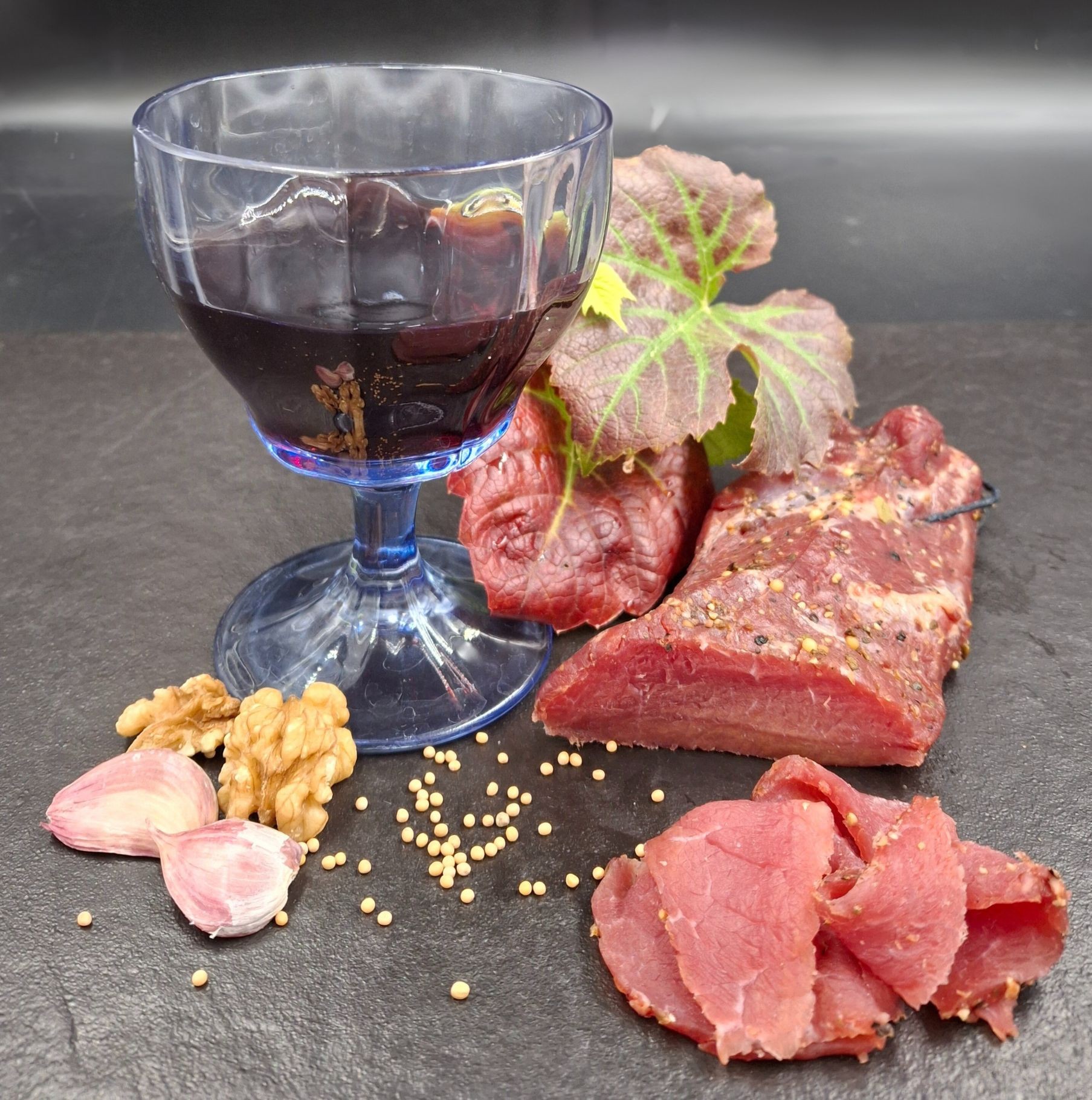 Zutaten: Wildschweinfleisch, Nitrit-Pökelsalz, (Kochsalz), Konservierungsstoff: E250, Gewürze, Antioxidationsmittel E316), Geschmacksverstärker (E621), Senf, Zuckerstoffe
